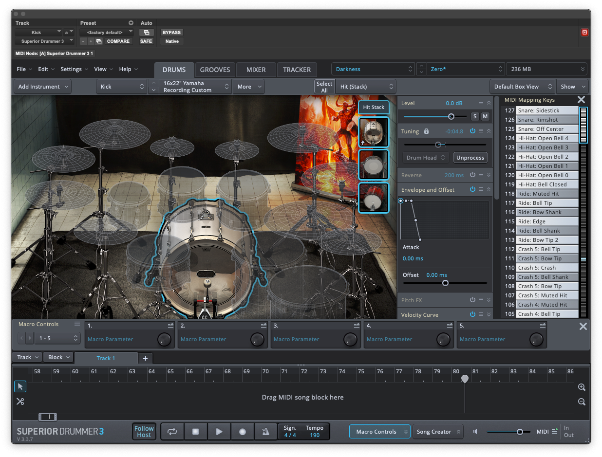 Layering ist üblich, aber nur dann sinnvoll, wenn die Phasen exakt passen. Besonders leicht wird das natürlich, wenn du mit Samples arbeitest – was im Metal durchaus die gängigste Variante ist. Außerdem lohnt es sich, Attack und Release im Tempo des Tracks so zu formen, dass selbst in schnellen Double-Kick-Passagen keine Note verschwimmt. Kürzer ist hier in der Regel besser, da du dir sonst schnell die Präzision und den Punch im Low-End vermatschen kannst.